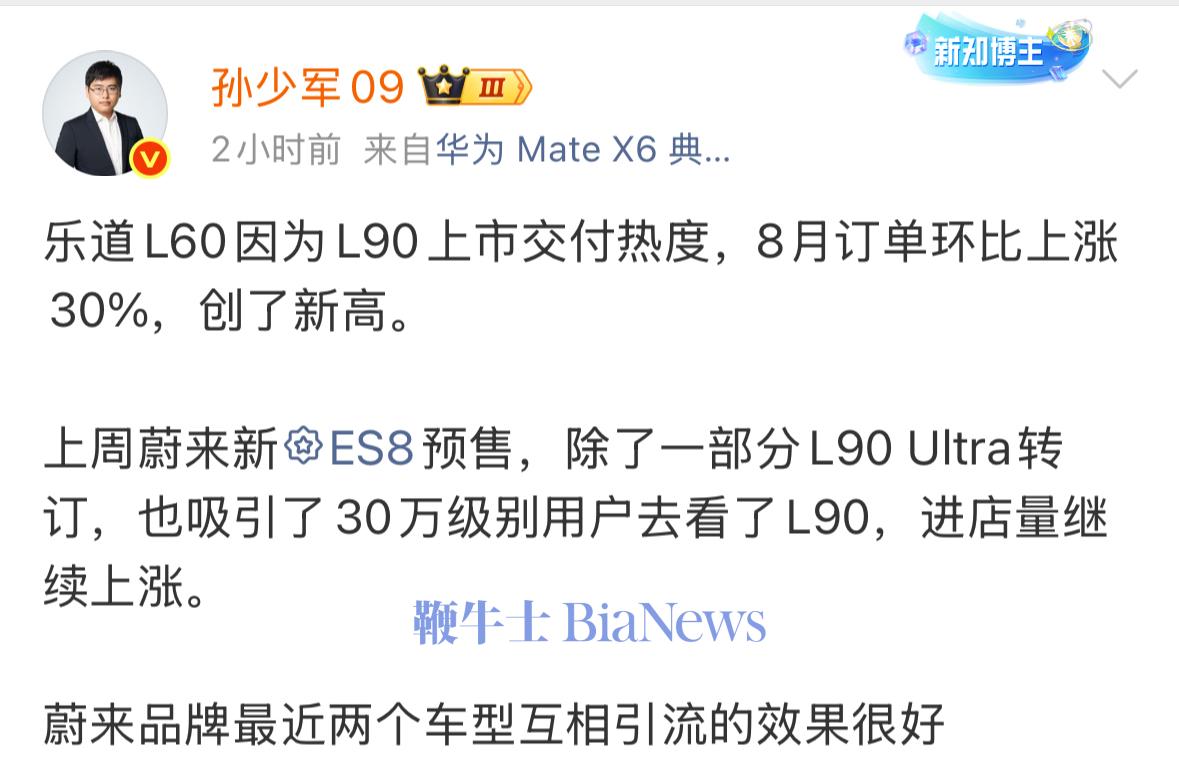 该博主表示,乐道旗下L60因L90上市交付热度,8月订单环比上涨30%,创新高。同时,蔚来新ES8开启预售,除使部分L90 Ultra订单转订外,还吸引30万级别用户关注L90。
